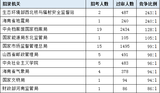 競爭最激烈部門與昨日相比,前十榜單進出變動不大,競爭力度最強的依然是生態環境部西北核與輻射安全監督站,目前競爭比已經達到243:1,其次是海南省地震局,以240:1的微弱差距暫居第二位,前兩名競爭力度都比較大,遠超其他部門。