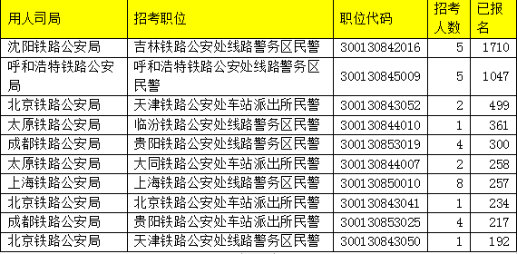 2020國考鐵路公安系統報名人數最多的十大崗位(截至21日17:00)