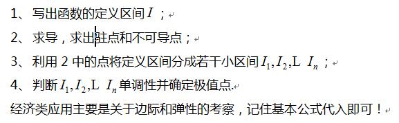 導數的應用主要考察兩方面:幾何應用和經濟類應用。幾何應用主要是考察單調區間和極值的求解,一般是解答題中考察,考生要注意步驟規范,具體步驟如下: