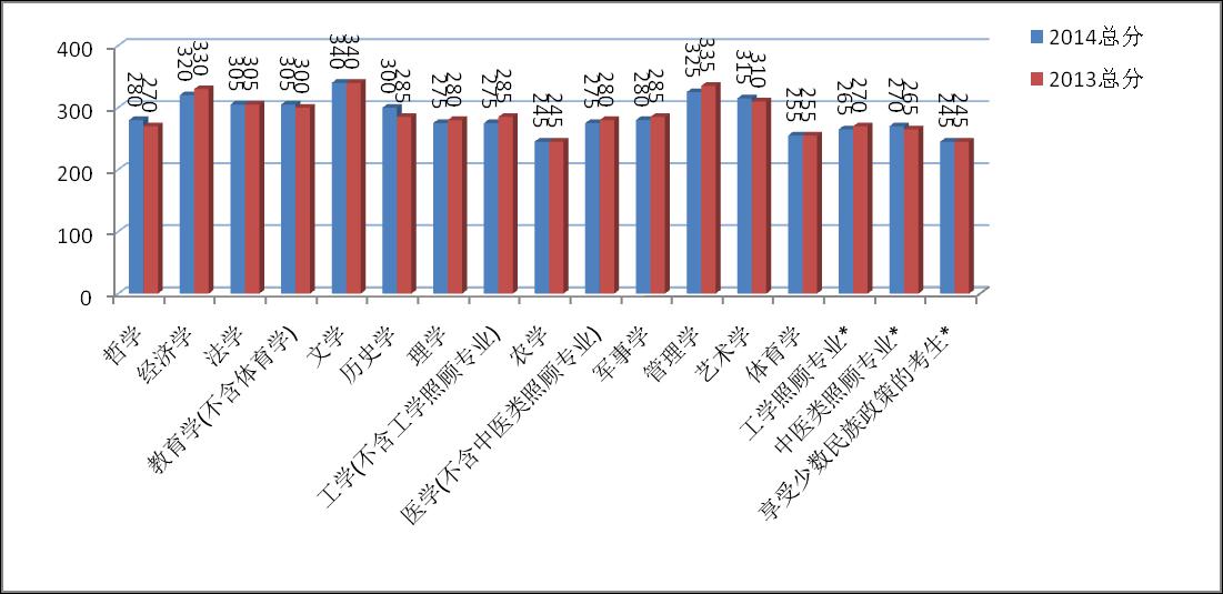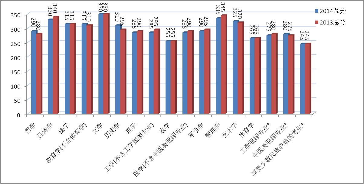 與2013年國家線相比,2014年學術型碩士A、B區國家線在哲學、教育學(不含體育學)、歷史學、藝術學、中醫類照顧專業等五個學科上有所上浮,其中歷史學分數漲幅高達15分。經濟學、管理學、理學、工學(不含工學照顧專業)、軍事學、工學照顧專業、醫學(不含中醫類照顧專業)等七個學科的分數線有5到10分的下降,其中經濟學與管理學分數降幅達到10分。法學、文學、農學、體育學、享受少數民族政策的考生的分數線保持不變。