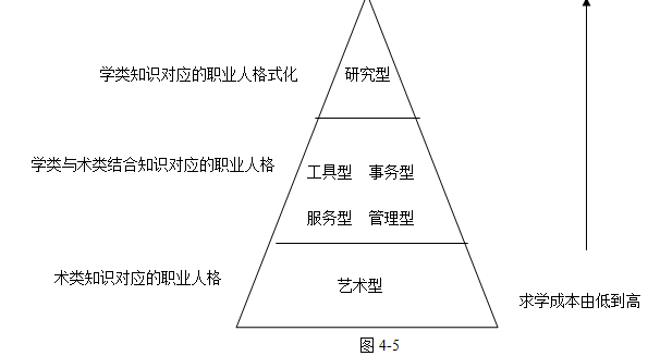 從職業人格角度來講,一般認為,研究型人格適合于學習學類知識,而藝術型人格則適合于學習術類知識,管理型、工具型、事務型、服務型則適合于學習學類與術類相結合的知識(如圖4-5)。 根據前面的概念,我們可以看到學類知識需要較高的求學時間、精力,也就是說,花費的求學成本比較高。一般都要從普通中學讀到大學畢業,甚至還需要繼續深造。而術類知識,更多側重于個人的悟性和實踐的積累,因此并不一定要按部就班的讀完中學、大學或者深造。它們各自所需的求學成本如圖4-5所示。這就要求我們在學業規劃時,要認真考慮自己所定的職業所需要的知識結構到底是學類知識、術類知識還是學術結合類知識,如果是術類或者學術結合類知識,則不需要按部就班地考高中、上大學,完全可以在初中畢業后上一個中;蛑新氼悓W校,盡快進入社會以提高個人發展的效率。通過實踐與理論的結合使自己盡快成長起來。
