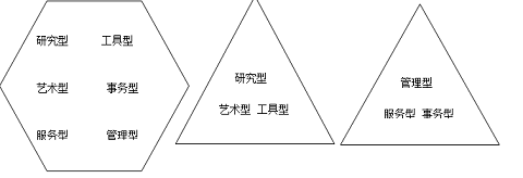 另外,在規劃學業生涯時還要符合這樣的原則:那就是投入(時間、精力、金錢)少,見效快。以最小的代價實現就業目標,實現個人經濟上的自立和相對自由。前面一再提到,不同的職業需要不同的學業生涯進行開發。按照美國哈佛大學教授霍蘭德的職業分類,我們可以對不同類別的職業所要求的學業生涯進行社會、經濟分析;籼m德教授將不同的職業按其人格的匹配度分為六大類型:研究型、管理型(企業型)、藝術型、服務型(社會型)、工具型(現實型)、常規型(事務型),每一種類型適合于不同的人格。這六大類型通過一個六角模型表現出來,其中連線比較短的相關度比較較強,否則比較弱。