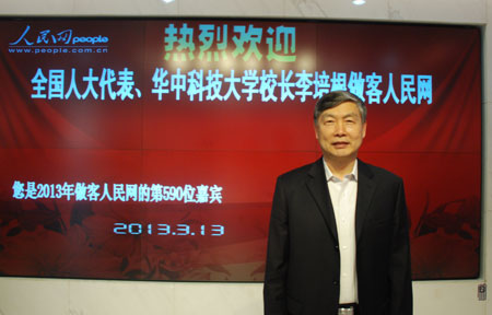 人民網北京3月13日電 (記者 熊旭)下午,全國人大代表、華中科技大學校長李培根院士做客人民網教育頻道,他認為,教育方針是使受教育者在德育、智育、體育幾方面得到全面發展,而目前教育教學有點像批量生產,不自覺地把學生當成是生產線上的產品,這對創新人才培養是不利的。