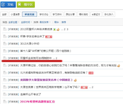 進入三月后,各種競賽競相開鑼:華杯賽復賽、希望杯決賽、學而思杯決賽、走美杯決賽……這些數學競賽的日期,不約而同地定在了民辦初中招生之前。記者在該論壇的太原站看到,有的標題竟直接發布《雙星杯金獎就可以直接去師院附中》的帖子,這樣的標題無疑給瀏覽論壇的家長帶來心理暗示:如果孩子在競賽中獲獎,那么是否有重點校直接接收呢?