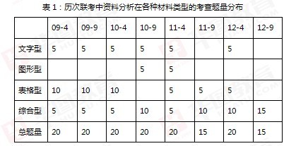 資料分析部分主要涉及三類基礎類型材料:文字型、圖形型、表格型,同時包含兩種以上基礎類型材料的稱為綜合型。表1為歷次聯考中資料分析在各種材料類型的考查題量分布表。