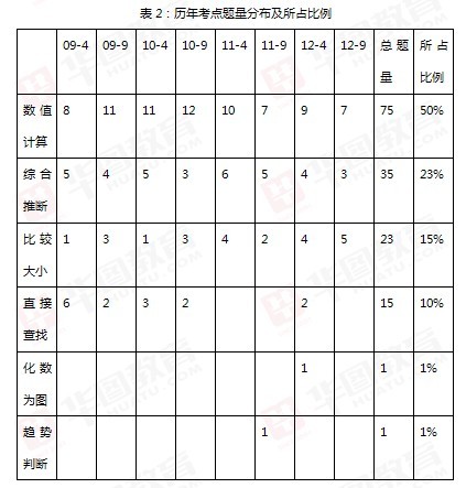從表1中可以看出:(1)文字型材料考查較為穩定,基本上均為一篇材料5道題;(2)圖形型材料單獨構成考試材料的概率將會很低;(3)表格型材料以其材料類型常見、考查內容基礎、涉及內容較多等特點,仍將是考查的材料類型;(4)綜合型材料逐漸成為資料分析的主要資料類型,這是隨著考試難度增加及考試更測重技巧性和實用性的必然結果。