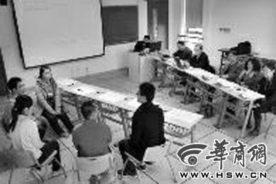 學生圍在一起討論,專家坐在一旁聆聽