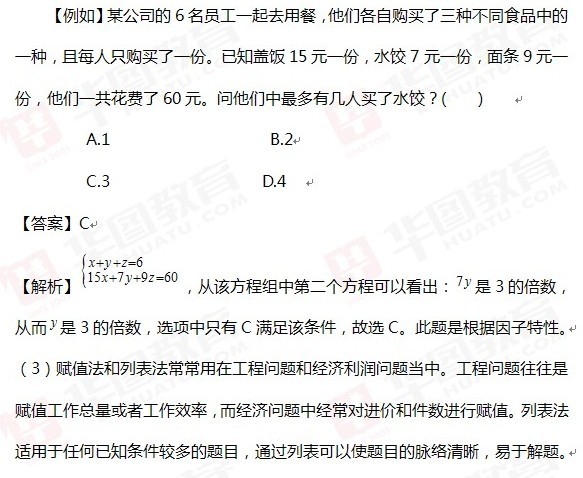 2.熟練使用五大常用方法:代入排除法、數字特性法、方程法、賦值法和列表法。