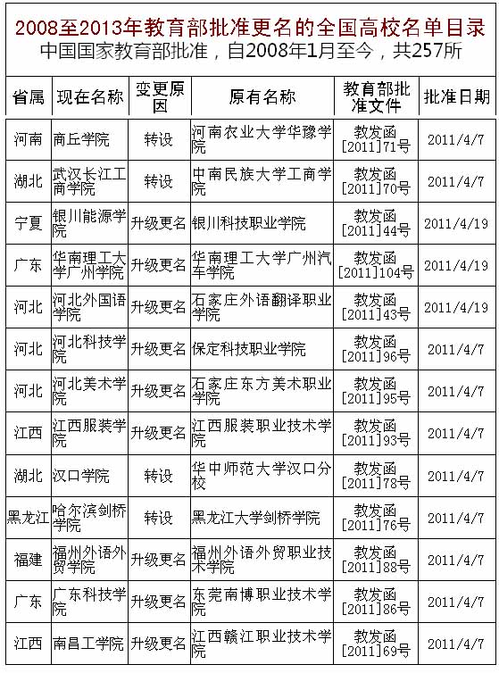 2008至2013年教育部批準更名的全國高校名單目錄【11】