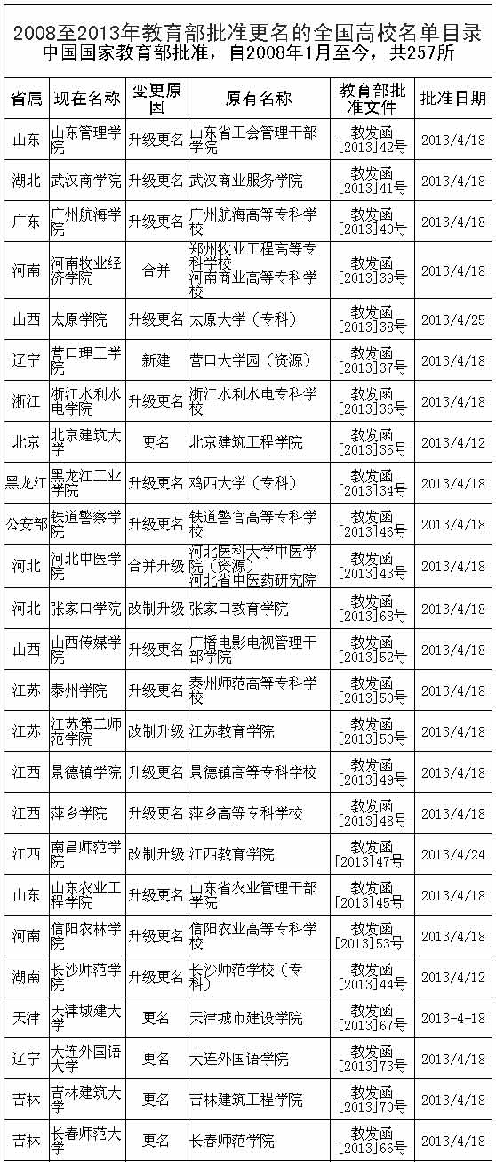 學校變成學院、學院升為大學。五年來,共有30所高等?茖W校升級更名為學院、59所學院更名為大學。例如,2013年4月,原同為高職的景德鎮高等?茖W校和萍鄉高等?茖W校,就分別更名為本科層次的景德鎮學院和萍鄉學院。在學院更名為大學的高校中,其中以中醫學院更為中醫藥大學、醫學院變成醫科大學、財經學院改為財經大學、科技學院更為科技大學、師范學院變成師范大學等比較多。例如福建、湖北、廣西、江西、安徽五省的中醫學院,在這五年里都先后更名為中醫藥大學。