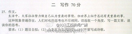 1北大賣豬肉校友談高考:我那時裸考 現在拼爹 22013年高考江蘇作文題 32013年高考安徽作文題 42013年高考江蘇卷作文題點評 5江蘇高考作文作者不確定看到的是蝴蝶(圖) 62013年高考福建作文題 72013年高考浙江作文題 82013年高考湖南作文題 92013年高考湖北作文題 10人大附中特級教師評2013年部分省高考作文題 |