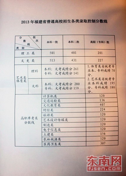 6月25日下午,福建省公布了2013年高考各科類、批次最低錄取控制分數線。