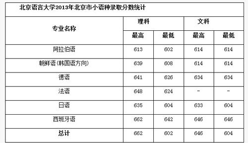 北京語言大學2013年北京市小語種錄取工作日前圓滿結束。據悉,今年該校北京市小語種錄取分專業按照總分排隊,擇優錄取。最終錄取34人,錄取理科最高為662分、最低602分,文科最高646分、最低604分,所有專業錄取分數均在600分以上。