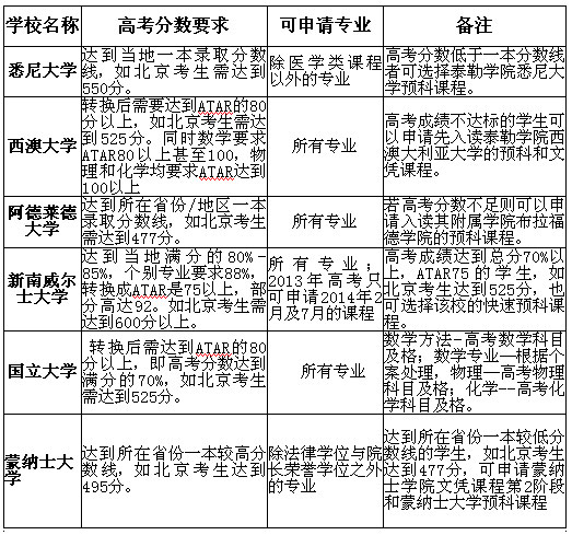 澳大利亞國立大學則是將中國的高考分數折算成澳洲的ATAR 成績,再對照相關本科專業的入學要求。不同的專業要求可能會有所差別,但都是ATAR80分以上,即高考分數達到滿分的70%。例如,2013年北京地區的學生,需要高考成績達到525分。若高考分數低于這一要求,則可以選擇澳洲國立大學的預科課程。