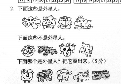 2013年1月末,一道“神一樣”的數學題走紅網絡,輪番考驗學生、家長、老師們的智力。這道據說是小學二年級考題的選擇題給出了四個外星人的圖案和四個不是外星人的圖案,讓學生根據以上信息圈出五個備選項中哪個是外星人。不少網友在解題失敗后只能得出結論:“出題的人才是外星人!