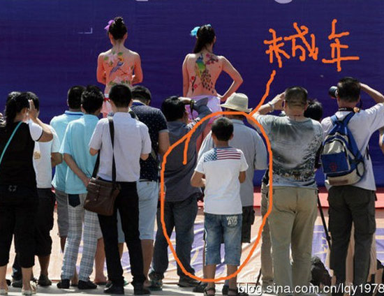 難道是中國人的性觀念不開放?開始踐行性教育從娃娃抓起了嗎?試想下,讓一個幼兒園的孩子看著一群女人穿著內衣在臺上大搖大擺;讓她看著一個只穿著薄薄內褲的女孩坐在眾人面前被人涂鴉,她那個小腦袋里會怎么想,咦,老師不是說了要講文明嗎,咋這個姐姐不穿衣服就出來了,真是不怕羞?捎挚吹侥敲炊嗳私o她們拍照,那么多閃光燈咔嚓作響,小腦袋肯定混亂起來,你說她們丑、不講文明,可咋那么多人還爭著與她們合影呢。唉,到底是不穿衣服是文明的、還是穿衣服是文明的呢?