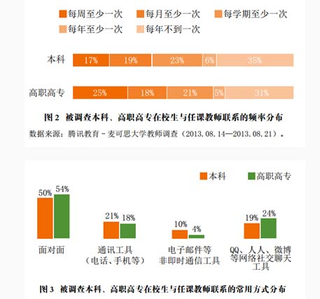 在被調查的本科生中,36%與任課教師每個月都有聯系,高職高專生的該比例為43%。同時,35%的本科生和31%的高職高專生與任課教師每年聯系不到一次。