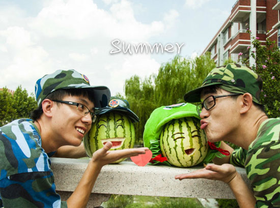 軍訓天氣炎熱,一只可以讓人清爽的大西瓜是必備品。而西瓜到了愛搞怪的學生手里,就變成了有思想有情緒的“西瓜君”。尤其是那兩只恩愛的西瓜情侶,好幸福的樣子,讓我們去感受一下吧。