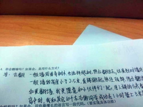 人民網北京9月27日電(歐興榮 實習生潘金潔瓊)網上一張名為《筆試題你們來感受下》的照片近日很火。據傳,該照片是某網絡公司招聘的筆試題,題目為:你會翻墻嗎?如果會,是用什么方式?該題旨在考查應聘者通過何種方式翻越網絡瀏覽國外網站,但一位應聘者把翻墻理解成爬墻,并聲情并茂的闡述了“如果有樹會依托樹爬出去”甚至還會“跟小伙伴們用人梯的方式翻出去”,網友看完簡直笑翻了,更有網友大呼:這么有創意的答案,一定要錄取他。那些年,各種民間高手曾在試卷上為我們奉獻了無數笑料,想看看都有哪些嗎?現在就讓小編為你盤點奇葩的考試答案!