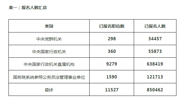 今天是國家公務員考試報名的第八天,也是報名結束的倒數第二日。截至今日10時,共11527個職位已有考生報名(占總職位數的98.3%),報名人數總量達到850462。