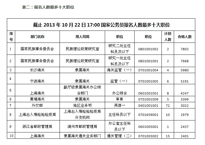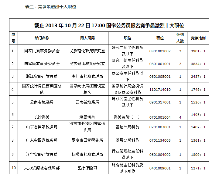 被稱為“炮灰集中營”的國家民委“民族理論政策研究室二處主任科員及以下“職位以3901:1的競爭比例保持了競爭最激烈職位第一名,國家民委“民族理論政策研究室一處主任科員及以下”和浙江省郵政管理局“湖州市郵政管理局辦公室主任科員以下”以3834:1、2437:1的微弱差別分列第二名、第三名。