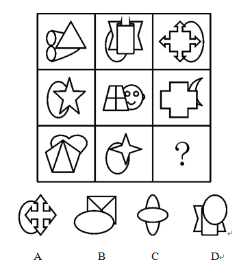 【解析】這道題考查的是曲直性。直接通過題干并不能十分直觀地分析出規律,但同時觀察選項就會發現每一個圖形都是由兩個小圖形組成,組成比較相似,而且BCD三個選項都有一個橢圓壓在另一個圖形上方,再看題干會發現,所給出的八個圖形都是直線圖形壓在曲線圖形上方,選項中只有A選項符合這個條件,所以選擇A選項。