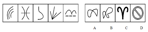 【解析】這道題考查的是封閉性。根據題干很難找到規律,僅能觀察出圖形間差異較大,而具體是何種規律還需要深入挖掘,但通過分析選項就比較容易看出區別。觀察選項尋找特殊圖形就會發現ABD都是封閉圖形,只有C選項是開放圖形,再回頭來看題干,發現題干也都是開放圖形。這就是通過特殊圖形區分選項之后再進行代入驗證,所以選擇C選項。