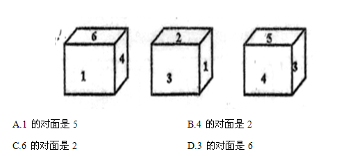【例4】有一個立方體,每個面上分別寫上數字l、2、3、4、5、6,有3 個人從不同角度觀察的結果如下圖所示,對這個立方體的每一個數字的對面的數字推斷不正確的是( )