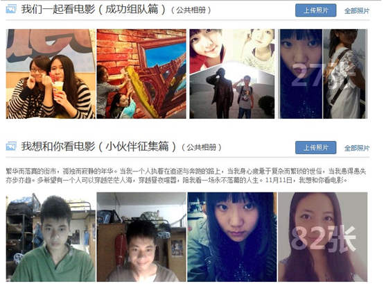 在光棍節前半個月,湖南大學愛電影協會組織了“11.11我想和你看電影”活動。在活動的宣傳詞中寫道:“多希望有一個人可以穿越茫茫人海,穿越晝夜喧囂,陪我看一場永不落幕的人生!庇^看影片為《我愛的是你愛我》,要求每一個想要參與活動的同學遞交個人信息(包括姓名、性別、年齡、院系、參與活動想說的話以及1-3張真實照片)。如果在活動相冊中發現了想要一起看電影的那個人,就在他/她的照片下回復,發出看電影的邀請,對方同意后可以享受優惠的觀影價格?措娪皡f會主頁將配對成功的同學的照片放到另一個相冊里。據該校同學介紹,照片累計點贊數的前五位會收到神秘大獎。目前,這個活動累計參與人數已過百,來自各個院系的帥哥美女們紛紛上傳真相,光棍節求陪同走起。