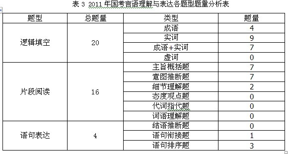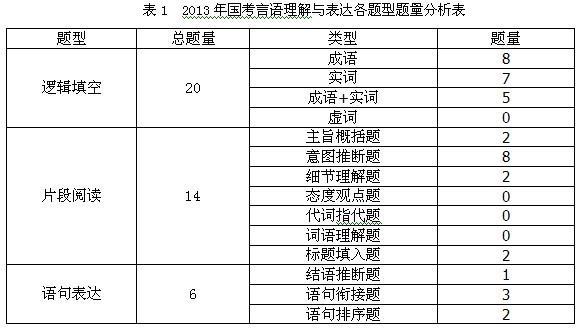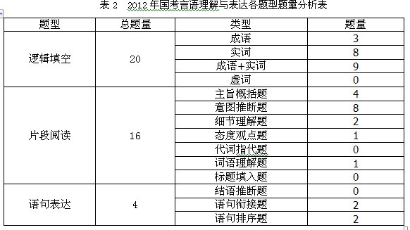 根據表1的匯總信息,2013年的言語理解與表達有一下特點:首先,在邏輯填空中沒有出現虛詞的考察題目,成語和實詞的考查已然是重點內容。。其次,在片段閱讀中,注意概括題、意圖推斷題和細節理解題這三個必考題型的總題量穩定,但是減少了對主旨的考查,增加了意圖題的題量。最后,在語句表達中,語句排序題出現兩道,已然成為國考中的必考題型之一。