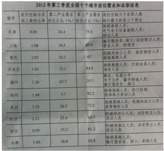 C.2012年第三季度在全國十個城市中,勞動力缺口最大的崗位