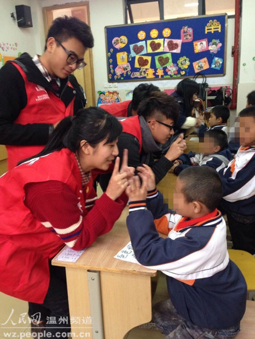 2013年11月28日,溫州大學城市學院啄木鳥、藍拇指志愿者服務中心的志愿者們來到溫州市特殊教育培訓學校,陪特教兒童共度感恩節。