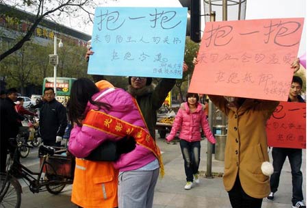感恩節前,山東大學生志愿者與一位清潔工人互相擁抱傳遞溫暖、愛心與感恩。