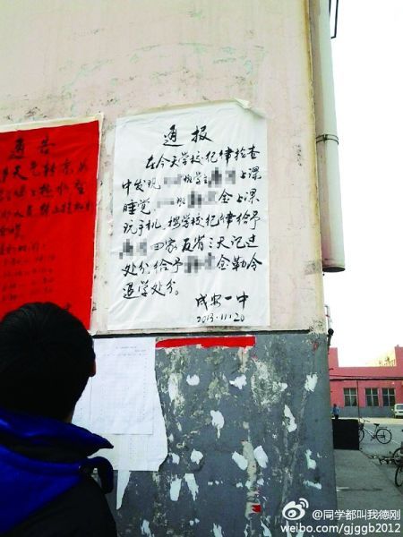 微博照片上的通告中寫著:在學校的紀律檢查中,有兩名學生分別存在“上課睡覺”和“上課玩手機”的情況,按學校紀律給予“回家反省三天記過處分”和“勒令退學處分”。最后落款處清楚地注明“成安一中,2013.11.20”。