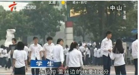 “黑色扣1分,水鉆、蕾絲扣兩分,豹紋、條紋、波點扣三分,有裝飾又有波點條紋再加蕾絲邊鑲水鉆的要記過!睋袊暋缎侣効v橫》報道,以上內容是廣東省中山市一所中學的一條校規,那種種顏色和款式說的其實是女生的內衣。根據學生們反映,學校規定,女生只能穿肉色內衣,不能穿有色內衣,否則就要寫1500字的檢討外加各種扣學分。之所以有這樣的規定,學校的解釋是,這么做是為了學生們好,因為學生們的校服太薄。