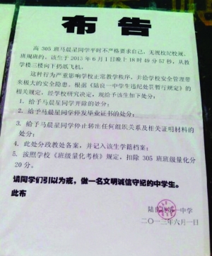 據網友披露,6月1日,云南省陸良一中兩名高中生因為在學校教學樓內“吹泡泡”和“扔紙飛機”,而被處以開除學籍、停發畢業證并記入學籍檔案的處分。根據微博上的照片顯示,陸良縣第一中學張貼出兩張《布告》,內容分別為:高344班閔某某同學“無視校紀校規,于2013年6月1日18時17分10秒,在教學樓三樓吹泡泡!备305班馬某某同學,“無視校紀校規,于2013年6月1日18時19分57秒,從教學樓三樓向下扔紙飛機!