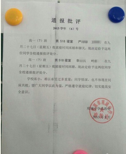 浙江慈溪市觀城中學高一7班兩對高中男生,一對因同床聊天和睡覺,另一對也因同床睡覺,受到全校通報批評處分。這在網上引起網友的熱烈討論。根據校方的解釋,學校宿舍床太小,難以承受過多重量,考慮到安全問題,即便同學情深,也不體現在同床共枕。望廣大同學以此為鑒,嚴格遵守就寢紀律,切實提高安全意識。
