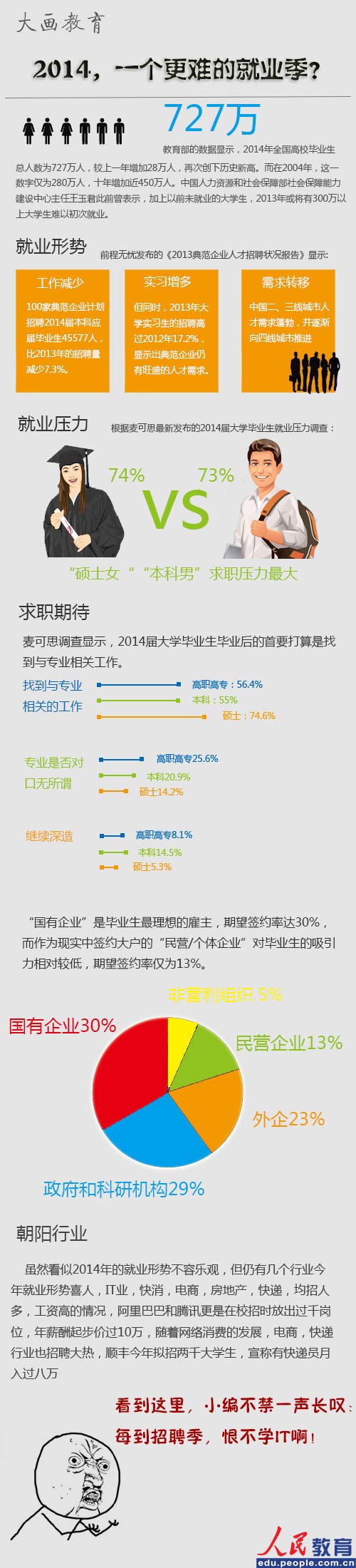 人民網北京12月13日(熊旭 實習生潘金潔瓊)2014年,727萬大學畢業生涌入就業市場,加上以前沒有就業的大學生,預計將有300萬大學生無法初次就業,但同時,物流,IT,電商等行業的飛速發展有為大學生們提供了更多高薪崗位,那么2014年是一個更難就業季嗎?為此人民網教育頻道推出“大畫教育”,小編為您圖解2014大學生就業形勢,如果喜歡,請在心里默默點贊!