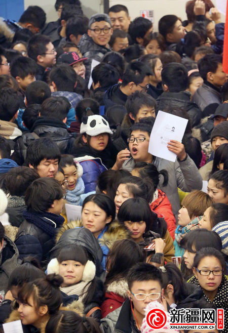 早晨11時許,新疆師范大學國際交流中心一樓擠滿了人,兩條長長的隊伍蜿蜒曲折。