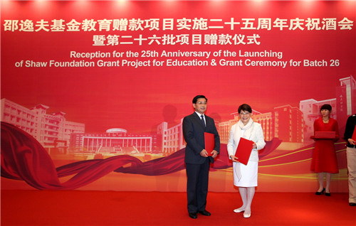 在2012年的“邵逸夫基金教育贈款項目25年慶;顒印鄙,教育部副部長郝平曾表示,“邵逸夫基金是當前海內外愛國人士通過教育部捐款持續時間最長、贈款金額最大、建設項目最多的教育贈款項目,為內地教育事業的發展做出了突出的貢獻!