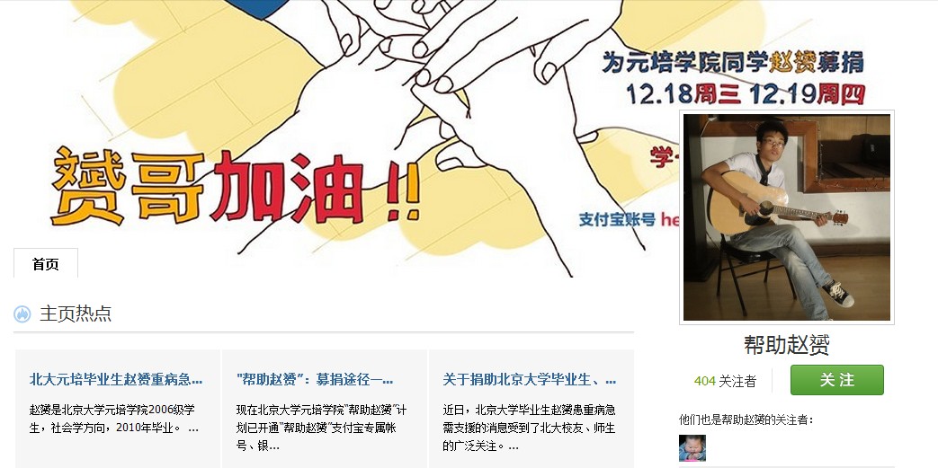 同時,北京大學元培學院也在人人網上建立了“幫助趙赟”公共主頁,上傳了趙赟的事跡報道、捐款渠道、在校照片等信息;向校新聞網上推送了“元培學院等單位向師生校友發倡議 捐助北大校友、支教志愿者趙赟”的新聞報道。讓在校師生更加立體地了解了趙赟校友,很多在校師生通過這些新聞報道,了解趙赟,關注趙赟,也為他的救治獻上了一份微薄之力。