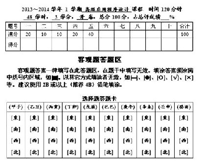 老師們不僅是在考題上搞新意,就連答題卡都不肯放過。近日,武漢理工大學的期末考試中就驚現另類答題卡。該答題卡的題目序號變成天干地支,選項變成“東南西北”,透著十足的中國風?勺屓艘馔獾氖,考試科目卻不是古漢語,而是《高級應用程序設計》。