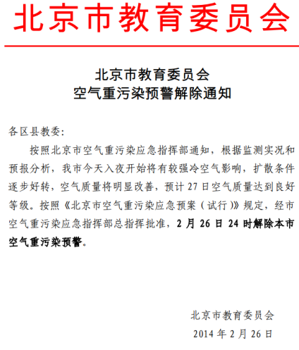人民網北京2月26日電(記者申寧 實習生韓東欽)北京市教育委員會今日發出通知,宣布解除空氣重污染預警。