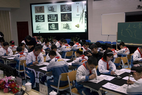 “不積跬步,無以至千里!比松姓嬲母袆油鶃碜杂趯ζ椒彩碌膱讨,真正的欣慰往往是堅持后的喜悅!皶ㄓ薪淌,寫字無專時,提筆即練字,貴在能堅持!鞭r大附小廣為傳頌的這句話,折射出學校20多年跨越四季的堅持和內修。學校能夠一以貫之堅持對學生進行書法教育,始終不輟。不因校舍動遷所荒廢,不因領導更迭而動搖,不因師資調整而中斷,不因社會時尚而迷失。在這里,書法教育營造了一個獨具特色的師生儒雅、合和共進的文化環境,身在其中的每個人都充分感受著書法之韻、之美,享受著揮毫潑墨帶來的愜意和美感。學校將練習書法與涵養品德緊密結合,引導學生不但手下把握漢字間架結構之美,更能心中牢固民族文化之魂,立意深遠,內容具體、形式活潑,特色鮮明。午間練字十分鐘、師生書法筆會、《書韻》廣播體操、新生入學開筆禮、《楹聯書法》國學啟蒙讀本首發式、迎新春寫春聯、社區送春聯等“小書法家行動”長效機制下的各項活動……從教材、課程、師資、設備、場地、活動、實踐等諸多方面構建了階梯式、序列化的體系,打造了書香校園。
