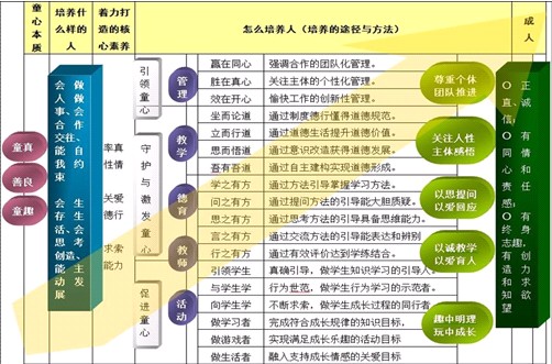 學校從管理、教學、德育、教師、學生幾個方面;從引領童心、守護童心到促進童心幾個角度;從培養什么樣的人到怎么培養人這一教育問題的提出與回答,形成了童心教育整體性發展的理念框架。架——童心的本質即童真、善良、童趣;童心教育就是要培養會做人做事、會合作交往、能自我約束、會生存生活、會思考創造、能主動發展的人;童心教育著力打造的核心素養為率真心情、關愛德行、求索能力;通過童心管理引領童心,通過童心教學、童心德育、童心教師的塑造守護激發童心,通過童心學生的培養促進童心;最終培養出正直誠信、有同情心和責任感、有終身志趣、有創造力和求知欲望的人。