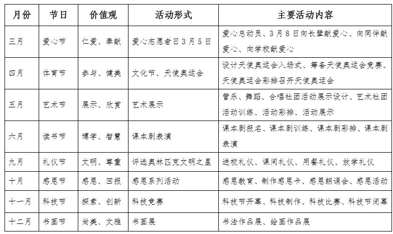 學校創建了《奧林匹克文化教育活動體系》,為培養國際素養的小公民搭建成長的舞臺,特色鮮明的活動貫穿全年。