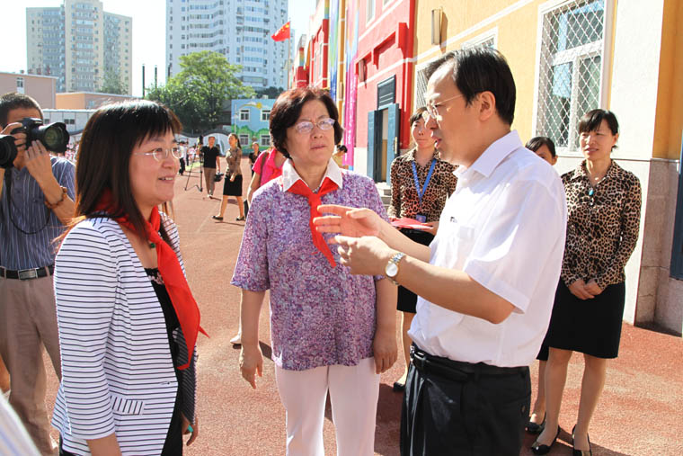 2013年8月31日,海淀區政府孫文楷區長(右一)出席人大附中實驗小學開學典禮暨更名儀式并就學校工作進行指導