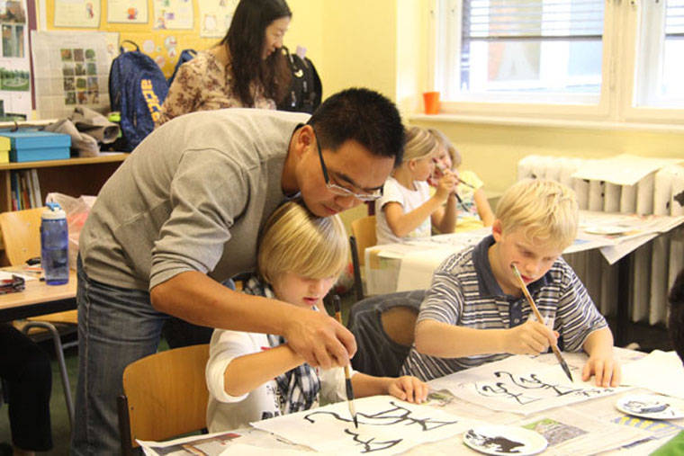 2011年9月,人大附中實驗小學實驗楊華老師為德國柏林維克多爾·格朗次小學同學上軟筆書法課。