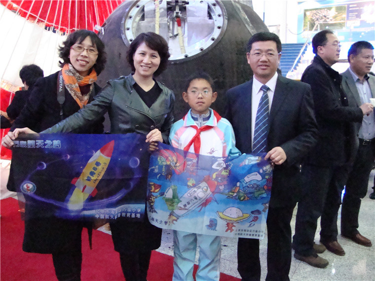 王正同學主創的“航天之夢”美術作品搭載神州八號勝利返航、景小霞校長、李春潔主任、中國空間技術研究院副院長尚志伯伯在返回艙。