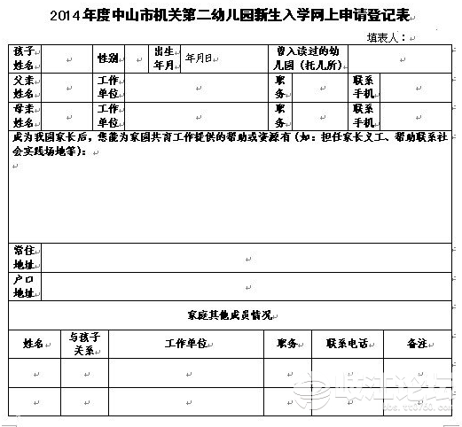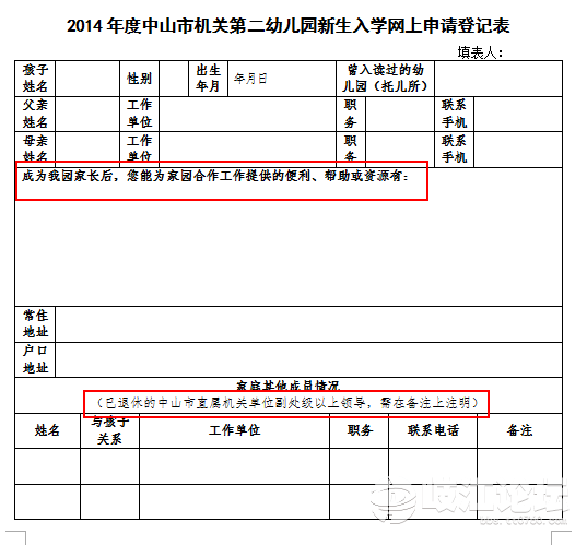 4月3日,網友發帖稱,中山二幼網上報名的表格要求填寫“成為我園家長后,能為二幼提供的便利,幫助或資源有什么?”、“中山直屬機關單位副處級以上領導要備注”,在表格的最后“家庭其他成員情況”一欄的確標注了“已退休的中山市直屬機關單位副處級以上領導,需在備注上注明”的信息。他質疑,幼兒園要求填寫這些內容太過功利。